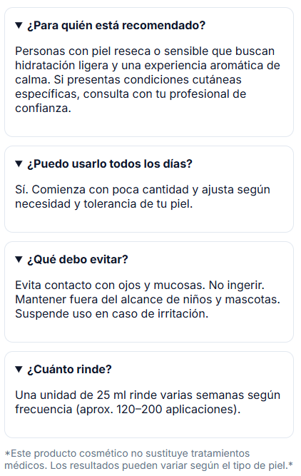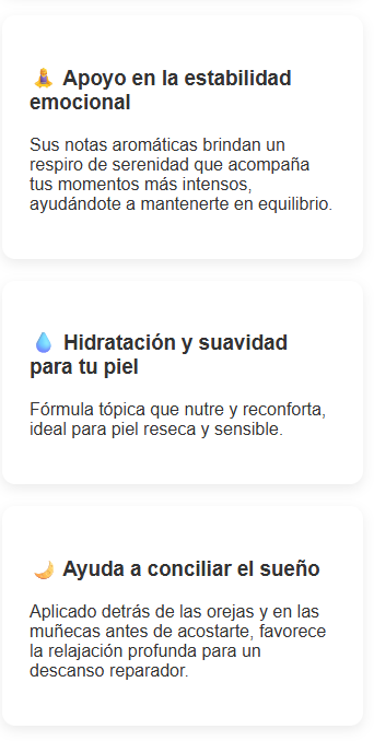 Su textura ligera y su aroma relajante ayudan a preparar cuerpo y mente para un descanso reparador, favoreciendo un sueño más profundo y sereno.