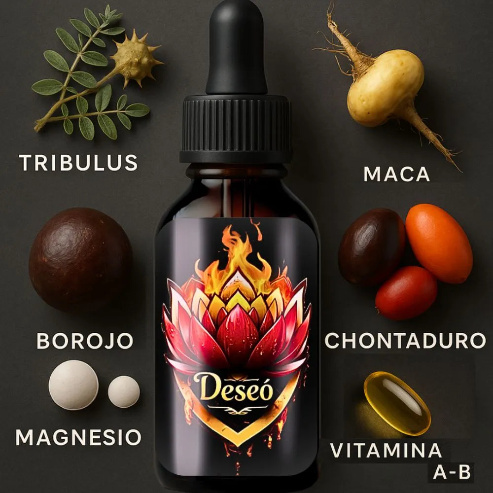 Cada frasco de Deseo combina extractos de plantas afrodisíacas premium que trabajan desde adentro para equilibrar tu cuerpo y mente.Componentes destacados: